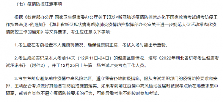 2?? 考生須如實記錄本人考前14天(12月11日-24日)的健康監(jiān)測情況,填寫《2022年湖北省研考考生健康考試承諾書》,并于12月25日上午第一場考試時交考點工作人員。