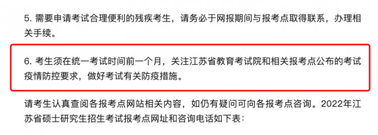 考生須在統(tǒng)一考試時間前一個月,關(guān)注江蘇省教育考試院和相關(guān)報考點公布的考試疫情防控要求,做好考試有關(guān)防疫措施。