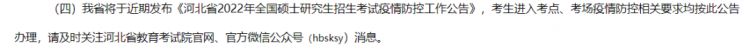 將于近期發(fā)布《河北省2022年全國碩士研究生招生考試疫情防控工作公告》。考生進入考點、考場疫情防控相關(guān)要求均按此公告辦理,請及時關(guān)注河北省教育考試院官網(wǎng)、官方微信公眾號(hbsksy)消息。
