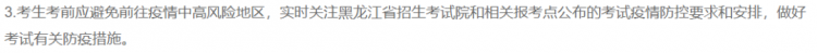 考生考前應避免前往疫情中高風險地區(qū),實時關(guān)注黑龍江省招生考試院和相關(guān)報考點公布的考試疫情防控要求和安排,做好考試有關(guān)防疫措施。
