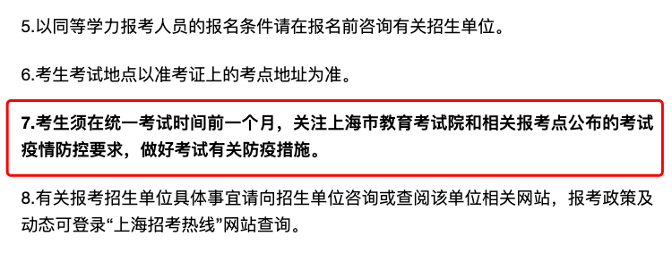 考生須在統(tǒng)一考試時間前一個月,關(guān)注上海市教育考試院和相關(guān)報考點公布的考試疫情防控要求,做好考試有關(guān)防疫措施。