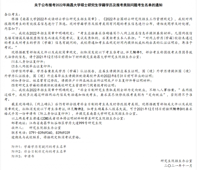 1.《關于取消部分2022年報考南昌大學碩士研究生考生考試資格的通知》公示了未如實填寫違紀情況考生名單和不符合報考條件考生名單。