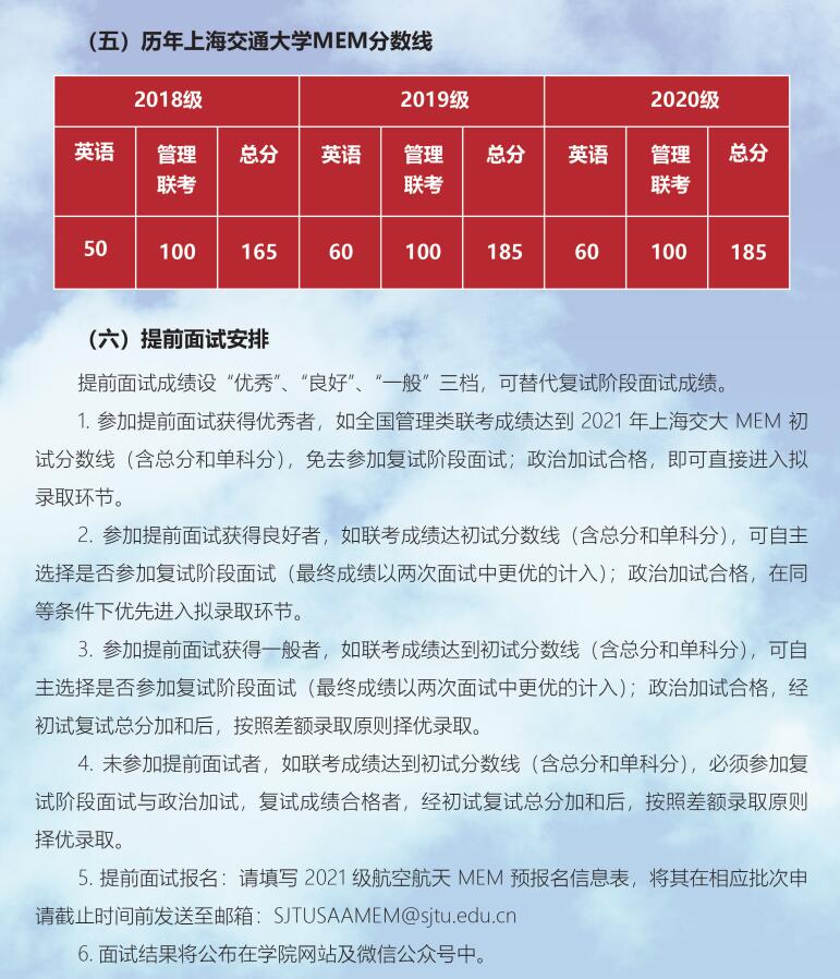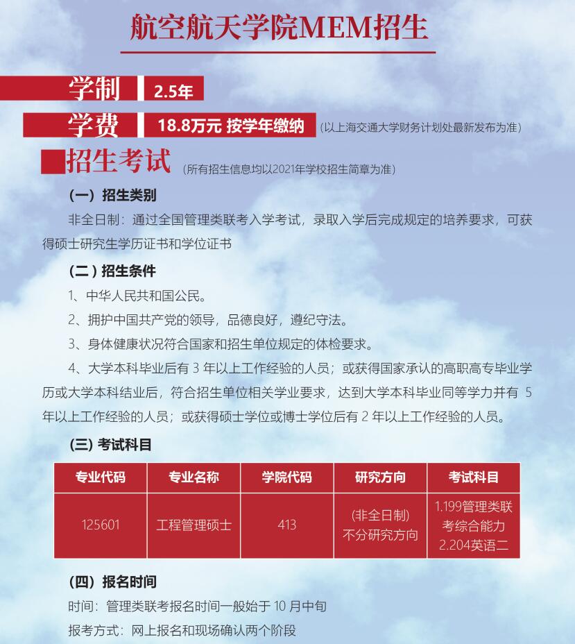 各大院校2021年碩士研究生招生簡(jiǎn)章正在陸續(xù)公布!各大院校碩士研究生招生簡(jiǎn)章為考生提供了院校招生計(jì)劃、報(bào)考條件、網(wǎng)上報(bào)名及現(xiàn)場(chǎng)確認(rèn)、資格審查等重要信息。復(fù)習(xí)備考,信息至關(guān)重要!今天,小編整理了“2021MEM招生簡(jiǎn)章|2021年上海交通大學(xué)航空航天學(xué)院MEM招生簡(jiǎn)章”的相關(guān)內(nèi)容!有相關(guān)報(bào)考意愿的同學(xué)一定要及時(shí)關(guān)注!