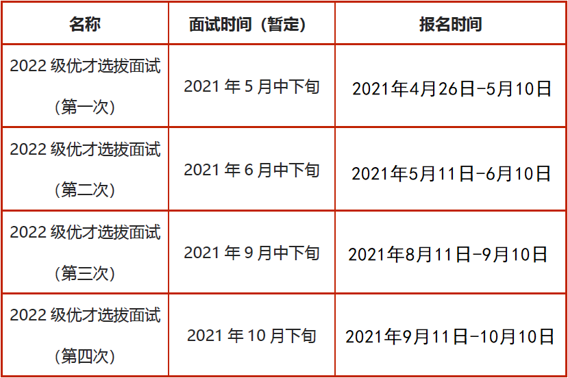 因?yàn)橐咔樵颍?022級優(yōu)才選拔面試暫定采用線上面試的形式,將于2021年4月26日啟動,詳細(xì)信息如下: