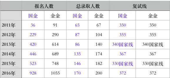 每年都有很多同學(xué)想要了解國(guó)金和金金哪個(gè)難,這個(gè)問題真的沒法給出具體的答復(fù),因?yàn)?ldquo;難”這個(gè)字很難定義,下面給出兩個(gè)學(xué)院2011-2016年的報(bào)錄比和復(fù)試線,大家自己對(duì)比一下,因?yàn)?017年沒有官方數(shù)據(jù),這里就沒有列出。