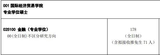 對(duì)外經(jīng)濟(jì)貿(mào)易大學(xué)2021年全日制金融專碩國(guó)際經(jīng)濟(jì)貿(mào)易學(xué)院擬錄取人數(shù)為127人,金融學(xué)院擬錄取人數(shù)為171人