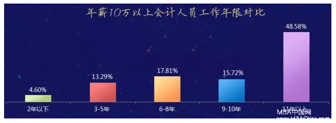 總體上看,會計行業(yè)是一個“厚積薄發(fā)”的行業(yè),隨著工作年限的增長,對會計工作了解的更加深入,經(jīng)驗更加豐富,因此想獲得相對比較好的薪水需要在這個行業(yè)不斷沉淀自己,從上圖可以看出,薪水超過10萬的會計人當中,工作年限3年以上的人數(shù)占比高達95%,會計工作很穩(wěn)定,值得大家托付一輩子。