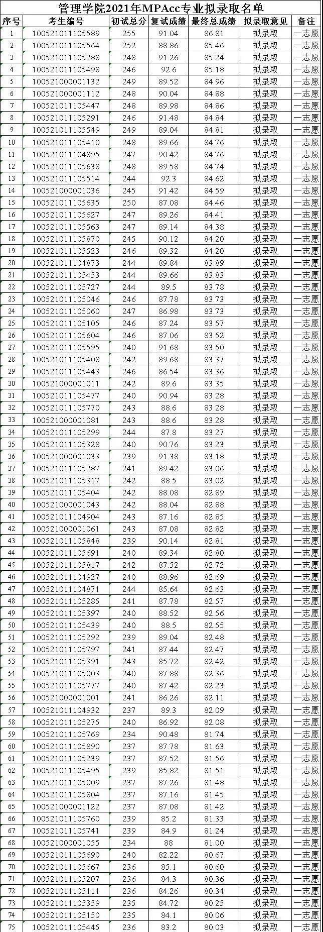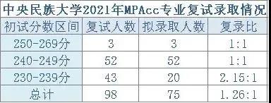 全日制 中央民族大學(xué)管理學(xué)院成立于2002年12月,以原來的政治經(jīng)濟(jì)學(xué)、政治學(xué)等學(xué)科為基礎(chǔ)組建,是一所綜合性管理學(xué)院,專業(yè)設(shè)置橫跨管理學(xué)和法學(xué)兩大學(xué)科門類,學(xué)科層次完備,擁有工商管理、公共管理、政治學(xué)三個一級學(xué)科碩士點,下設(shè)中外政治制度、科學(xué)社會主義與國際共產(chǎn)主義運動、國際關(guān)系、民族政治學(xué)、行政管理、民族地區(qū)公共行政管理、教育經(jīng)濟(jì)與管理、社會保障、企業(yè)管理、技術(shù)經(jīng)濟(jì)與管理、會計學(xué)、旅游管理十二個碩士學(xué)位點,還有公共管理專業(yè)碩士(MPA)和工商管理碩士(MBA)學(xué)位授予權(quán);設(shè)有民族政治學(xué)、民族地區(qū)行政管理、工業(yè)社會管理三個專業(yè)博士學(xué)位點。 在學(xué)科建設(shè)與人才培養(yǎng)方面突出效率、公平兩大目標(biāo)。 2021年MPAcc專業(yè)招生信息 中央民族大學(xué)2021年招收全日制考生64人,學(xué)制2年,復(fù)試基本分?jǐn)?shù)線為233/46/92。 2021年MPAcc專業(yè)錄取情況 中央民族大學(xué)2021年MPAcc專業(yè)一志愿進(jìn)入復(fù)試全日制考生98人,擬錄取75人; 在錄取考生中,居于240-249分的考生占比最大。 2021年MPAcc專業(yè)一志愿擬錄取名單 全日制復(fù)試98人,最高分255分,最低分233分; 擬錄取最高分255分,最低分234分; 士兵計劃擬錄取兩名,分?jǐn)?shù)分別為220、173分 報考指南復(fù)試形式:線上復(fù)試復(fù)試內(nèi)容: (1)綜合面試(含專業(yè)考核、外國語聽說能力測試)。 (2)管理類聯(lián)考考生(MBA、MPA等)需按學(xué)院要求進(jìn)行思想政治理論考核。 (3)同等學(xué)力考生需加試兩門本科階段主干課程(筆試),可采取在線監(jiān)考方式進(jìn)行。 (4)在復(fù)試考核中應(yīng)加強對考生思想品德的考核。