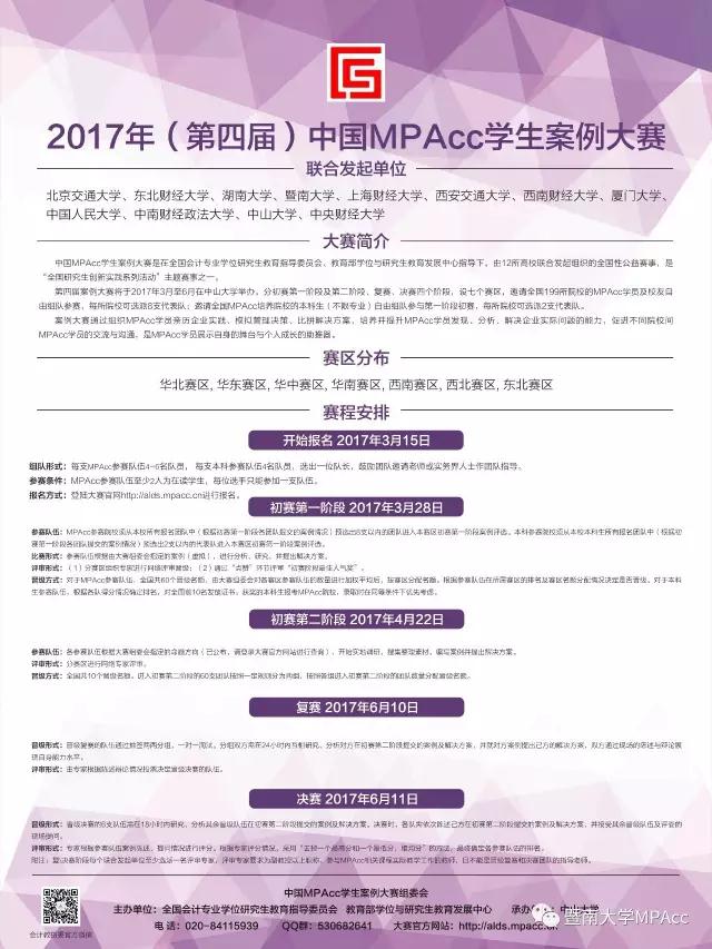 本屆學(xué)生案例大賽由中山大學(xué)承辦,2017年3月15日開(kāi)始報(bào)名,具體賽程安排和大賽介紹請(qǐng)點(diǎn)擊中國(guó)MPAcc學(xué)生案例大賽官網(wǎng) http://alds.mpacc.cn/ 進(jìn)行查看,或點(diǎn)擊下圖查看賽程安排。
