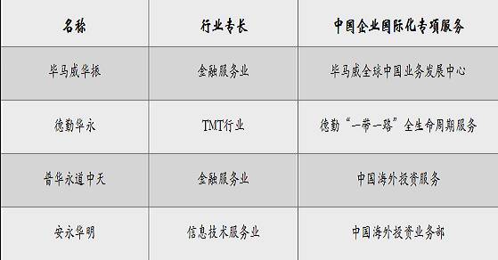 此外,報(bào)告還對國際“四大”涉及中國走出去服務(wù)類型、業(yè)務(wù)覆蓋網(wǎng)絡(luò)和服務(wù)行業(yè)進(jìn)行匯總,為中企提供參考。