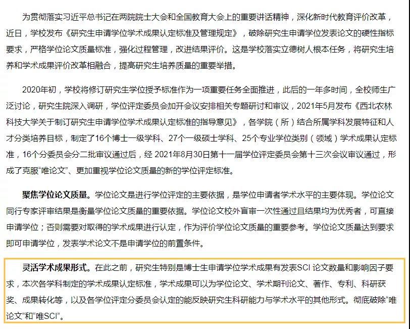但是從去年開(kāi)始教育部就發(fā)布《關(guān)于破除高校哲學(xué)社會(huì)科學(xué)研究評(píng)價(jià)中“唯論文”不良導(dǎo)向的若干意見(jiàn)》。 其中提及到:不得將在學(xué)術(shù)期刊上發(fā)表論文作為學(xué)位授予的唯一標(biāo)準(zhǔn)。 2020~2021學(xué)年度第9次校務(wù)會(huì)議修訂的《攻讀碩士學(xué)位研究生培養(yǎng)工作規(guī)定》堅(jiān)決破除碩士生學(xué)位評(píng)定中的“唯論文”傾向,取消“非專(zhuān)業(yè)學(xué)位碩士生應(yīng)至少完成一篇與學(xué)位論文內(nèi)容相關(guān)且達(dá)到發(fā)表要求的論文”的要求,不把發(fā)表學(xué)術(shù)論文作為申請(qǐng)學(xué)位論文答辯或申請(qǐng)學(xué)位的前置條件。 2021年9月8日,貴州大學(xué)官網(wǎng)公布了《貴州大學(xué)博士、碩士學(xué)位授予工作實(shí)施辦法》(2021年修訂版),新辦法刪除了要求碩博研究生必須發(fā)表學(xué)術(shù)論文才能畢業(yè)的規(guī)定。 近日,西北農(nóng)林科技大學(xué)發(fā)布《研究生申請(qǐng)學(xué)位學(xué)術(shù)成果認(rèn)定標(biāo)準(zhǔn)及管理規(guī)定,其中提及學(xué)位論文質(zhì)量達(dá)到要求即可申請(qǐng)學(xué)位,發(fā)表學(xué)術(shù)論文不是申請(qǐng)學(xué)位的前置條件。徹底破除“唯論文”和“唯SCI”。