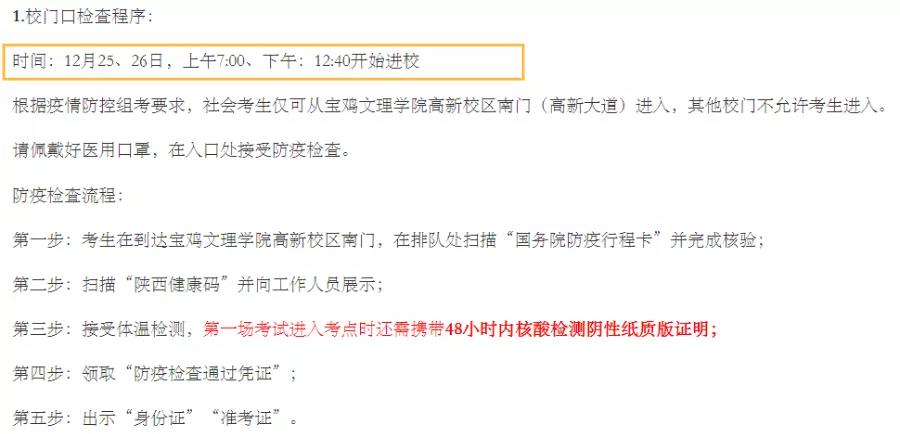 根據(jù)疫情防控組考要求,社會(huì)考生僅可從寶雞文理學(xué)院高新校區(qū)南門(高新大道)進(jìn)入,其他校門不允許考生進(jìn)入。