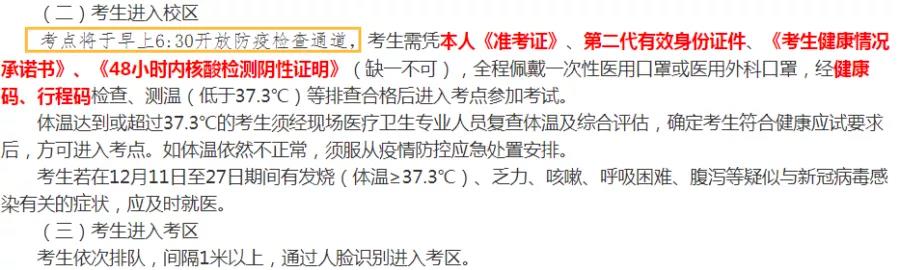 考點(diǎn)將于早上6:30開放防疫檢查通道,考生需憑本人《準(zhǔn)考證》、第二代有效身份證件、《考生健康情況承諾書》、《48小時(shí)內(nèi)核酸檢測(cè)陰性證明》(缺一不可),全程佩戴一次性醫(yī)用口罩或醫(yī)用外科口罩,經(jīng)健康碼、行程碼檢查、測(cè)溫(低于37.3℃)等排查合格后進(jìn)入考點(diǎn)參加考試。