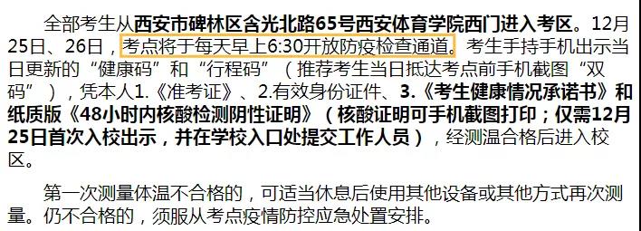 全部考生從西安市碑林區(qū)含光北路65號(hào)西安體育學(xué)院西門進(jìn)入考區(qū)。12月25日、26日,考點(diǎn)將于每天早上6:30開放防疫檢查通道??忌殖质謾C(jī)出示當(dāng)日更新的“健康碼”和“行程碼”(推薦考生當(dāng)日抵達(dá)考點(diǎn)前手機(jī)截圖“雙碼”)
