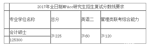 在教育部公布的《2017年全國碩士研究生招生考試考生進入復(fù)試的初試成績基本要求》的基礎(chǔ)上,廈門國家會計學(xué)院根據(jù)2017年會計專業(yè)碩士研究生(MPAcc)招生計劃數(shù),采取1:1.5差額復(fù)試,確定復(fù)試分數(shù)線如下(見下面表格)。廈門國家會計學(xué)院2017年全日制MPAcc研究生招生計劃為80人(含1名推免生),非全日制MPAcc研究生招生計劃為30人。