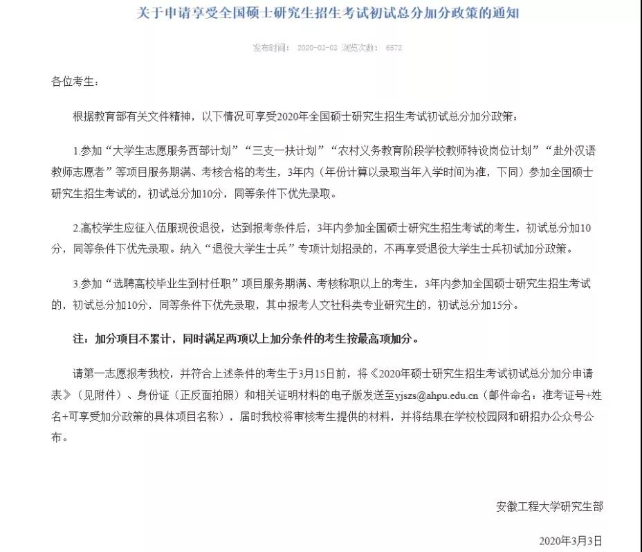 每所學(xué)校對(duì)加分政策的要求會(huì)有所改變,有相關(guān)條件的學(xué)生應(yīng)及時(shí)到院校研究生官網(wǎng)查看。