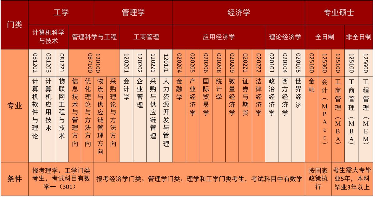 目前我校擁有應(yīng)用經(jīng)濟(jì)學(xué)、理論經(jīng)濟(jì)學(xué)、管理科學(xué)與工程、工商管理、計(jì)算機(jī)科學(xué)與技術(shù)共5個(gè)一級(jí)學(xué)科碩士學(xué)位授權(quán),下設(shè)22個(gè)二級(jí)學(xué)科(研究方向)碩士學(xué)位授予權(quán)。我校還擁有金融專碩、會(huì)計(jì)專碩(MPAcc)、工商管理碩士(MBA)、工程管理碩士(MEM)(物流工程方向)4個(gè)專業(yè)學(xué)位碩士培養(yǎng)類別。具體招生專業(yè)和方向如下圖所示: