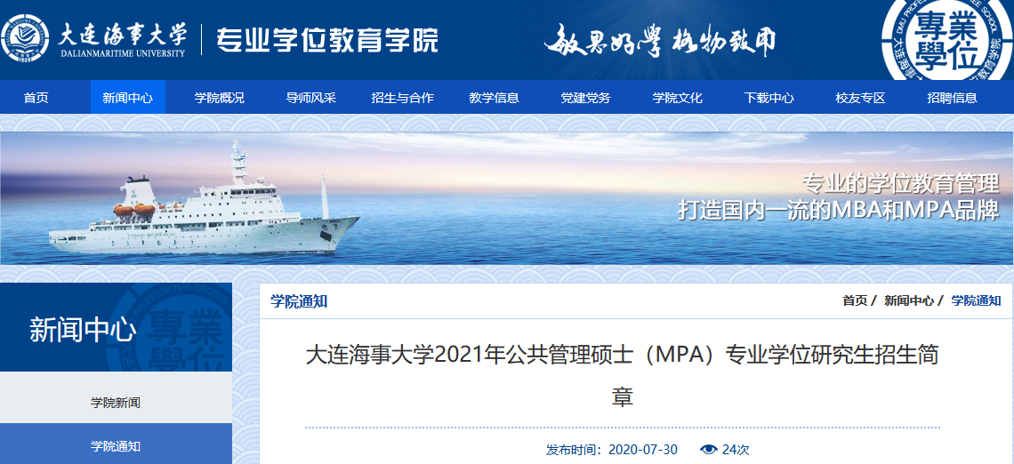 大連海事大學(xué)是享譽(yù)世界的海事院校,是經(jīng)國務(wù)院學(xué)位委員會批準(zhǔn)的具有公共管理碩士(MPA)辦學(xué)資格的授權(quán)單位之一。大連海事大學(xué)MPA項目是為適應(yīng)新形勢下社會管理現(xiàn)代化、科學(xué)化、專業(yè)化的要求,專門為政府部門及其它非政府公共機(jī)構(gòu),特別是交通、港航和海事系統(tǒng)培養(yǎng)高素質(zhì)、復(fù)合型、應(yīng)用型中高層公共管理人才的高等教育項目。
