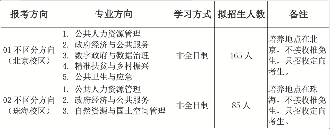 說(shuō)明:10月網(wǎng)上報(bào)名時(shí)只填報(bào)報(bào)考方向,正式錄取后再分專業(yè)方向。 【初試科目】: 199-管理類聯(lián)考綜合能力(滿分200分)、 204-英語(yǔ)二(滿分100分),均為筆試。 一、MPA培養(yǎng)目標(biāo)與特色 北京師范大學(xué)是教育部直屬重點(diǎn)大學(xué),是一所學(xué)科實(shí)力位居全國(guó)高校前列的百年學(xué)府,2017年入選世界一流大學(xué)建設(shè)計(jì)劃。北京師范大學(xué)是全國(guó)首批培養(yǎng)公共管理碩士專業(yè)學(xué)位(Master of Public Administration,簡(jiǎn)稱MPA)的院校之一,也是首批獲得公共管理一級(jí)學(xué)科博士學(xué)位授予權(quán)的高校之一。2018年,北京師范大學(xué)公共管理專業(yè)學(xué)位教育在全國(guó)首次專業(yè)學(xué)位水平評(píng)估中獲評(píng)A-。 基于當(dāng)前的時(shí)代要求和學(xué)校自身的定位及特色,北京師范大學(xué)MPA教育以“掌握公共管理知識(shí)和技能,具備公共服務(wù)精神和國(guó)際視野,能夠引領(lǐng)經(jīng)濟(jì)社會(huì)變革和發(fā)展的政府部門及非政府公共機(jī)構(gòu)高層次管理者”為人才培養(yǎng)目標(biāo),不斷推動(dòng)教育模式創(chuàng)新,形成“扎實(shí)的學(xué)科依托、充足的教學(xué)資源、顯著的培養(yǎng)效果、多元的活動(dòng)服務(wù)”的辦學(xué)特色,成為國(guó)內(nèi)重要的MPA人才培養(yǎng)基地。 二、招生人數(shù)與招生方向 - 招生計(jì)劃:擬招收250人。 - 報(bào)考方向:2022年招生分“01不區(qū)分方向(北京校區(qū))”和“02不區(qū)分方向(珠海校區(qū))”兩個(gè)報(bào)考方向。 - 主要招生專業(yè)方向:公共人力資源管理、政府經(jīng)濟(jì)與公共服務(wù)、數(shù)字政府與數(shù)據(jù)治理、自然資源與國(guó)土空間管理、精準(zhǔn)扶貧與鄉(xiāng)村振興、公共衛(wèi)生與應(yīng)急。 不同報(bào)考方向(校區(qū))招生計(jì)劃見(jiàn)下表: 說(shuō)明:10月網(wǎng)上報(bào)名時(shí)只填報(bào)報(bào)考方向,正式錄取后再分專業(yè)方向。 三、報(bào)考條件 考生報(bào)名須滿足以下條件: 1.考生須為中華人民共和國(guó)公民,擁護(hù)中國(guó)共產(chǎn)黨的領(lǐng)導(dǎo),品德良好,遵紀(jì)守法。 2.身體健康狀況符合國(guó)家和我校規(guī)定的體檢要求。 3.學(xué)歷和工作條件必須符合下列情況之一: (1)獲得國(guó)家承認(rèn)的大學(xué)本科學(xué)歷已滿3年并有相應(yīng)的工作經(jīng)歷(從畢業(yè)后到2022年9月前)。 (2)獲得國(guó)家承認(rèn)的高職高專學(xué)歷已滿5年并有相應(yīng)的工作經(jīng)歷(從畢業(yè)后到2022年9月前)。 (3)獲碩士、博士學(xué)位已滿2年并有相應(yīng)的工作經(jīng)歷。 (4)在境外獲得的學(xué)歷(學(xué)位)證書須通過(guò)(中國(guó))教育部留學(xué)服務(wù)中心認(rèn)證,資格審查時(shí)須提交認(rèn)證報(bào)告。 非應(yīng)屆在讀研究生(含單證專業(yè)學(xué)位碩士生)報(bào)考,須在報(bào)名前征得就讀院校同意,并在錄取時(shí)先辦理原就讀院校的退學(xué)手續(xù)。我校不允許研究生同時(shí)攻讀兩個(gè)以上(含)不同層次或相同層次的學(xué)位。 四、報(bào)名 考生報(bào)名前應(yīng)仔細(xì)閱讀我校的報(bào)考條件,確認(rèn)完全符合條件后再進(jìn)行網(wǎng)上報(bào)名。網(wǎng)上報(bào)名時(shí)必須如實(shí)、準(zhǔn)確地填寫信息。不符合報(bào)考條件或弄虛作假者一律不予錄取,報(bào)考資格審核將在錄取階段進(jìn)行。 報(bào)名包括網(wǎng)上報(bào)名和網(wǎng)上(現(xiàn)場(chǎng))確認(rèn)兩個(gè)階段,缺一不可??忌鷳?yīng)于2021年10月(具體以教育部公布的時(shí)間為準(zhǔn))登陸“中國(guó)研究生招生信息網(wǎng)(http://yz.chsi.com.cn)”瀏覽報(bào)考須知,按教育部、省級(jí)教育招生考試管理機(jī)構(gòu)、報(bào)考點(diǎn)以及報(bào)考招生單位的網(wǎng)上公告要求報(bào)名,并于規(guī)定時(shí)間到報(bào)考點(diǎn)進(jìn)行網(wǎng)上(現(xiàn)場(chǎng))確認(rèn)??忌鷳?yīng)認(rèn)真核對(duì)報(bào)名信息,報(bào)名結(jié)束后報(bào)名信息不允許修改,因填寫錯(cuò)誤造成的一切后果由考生本人承擔(dān)。 報(bào)名關(guān)鍵信息提醒 - 報(bào)考專業(yè): 公共管理(專業(yè)學(xué)位碩士,專業(yè)代碼125200) - 考試科目: 管理類聯(lián)考綜合能力(199)、英語(yǔ)二(204) - 報(bào)考類別: 定向就業(yè) 報(bào)名費(fèi)直接在“中國(guó)研究生招生信息網(wǎng)”繳納。逾期不再補(bǔ)報(bào),也不得再修改報(bào)名信息。 五、考試 考試分初試和復(fù)試兩階段。 (一)初試 1.初試時(shí)間:2021年12月25日至12月26日(每天上午8:30-11:30,下午14:00-17:00)。 2.初試科目 ① 199-管理類聯(lián)考綜合能力(滿分200分)、② 204-英語(yǔ)二(滿分100分),均為筆試。 其中管理類聯(lián)考綜合能力為全國(guó)聯(lián)考科目,內(nèi)容請(qǐng)參考教育部考試中心編制的最新考試大綱;英語(yǔ)二為全國(guó)統(tǒng)考科目,內(nèi)容請(qǐng)參考教育部考試中心統(tǒng)一編制的最新考試大綱。 3.準(zhǔn)考證從中國(guó)研究生招生信息網(wǎng)下載。考生憑準(zhǔn)考證及有效居民身份證參加初試。 (二)復(fù)試(考前面試與正常批復(fù)試) 1.考前面試 (1)考前面試日程安排(2022年考前面試申請(q