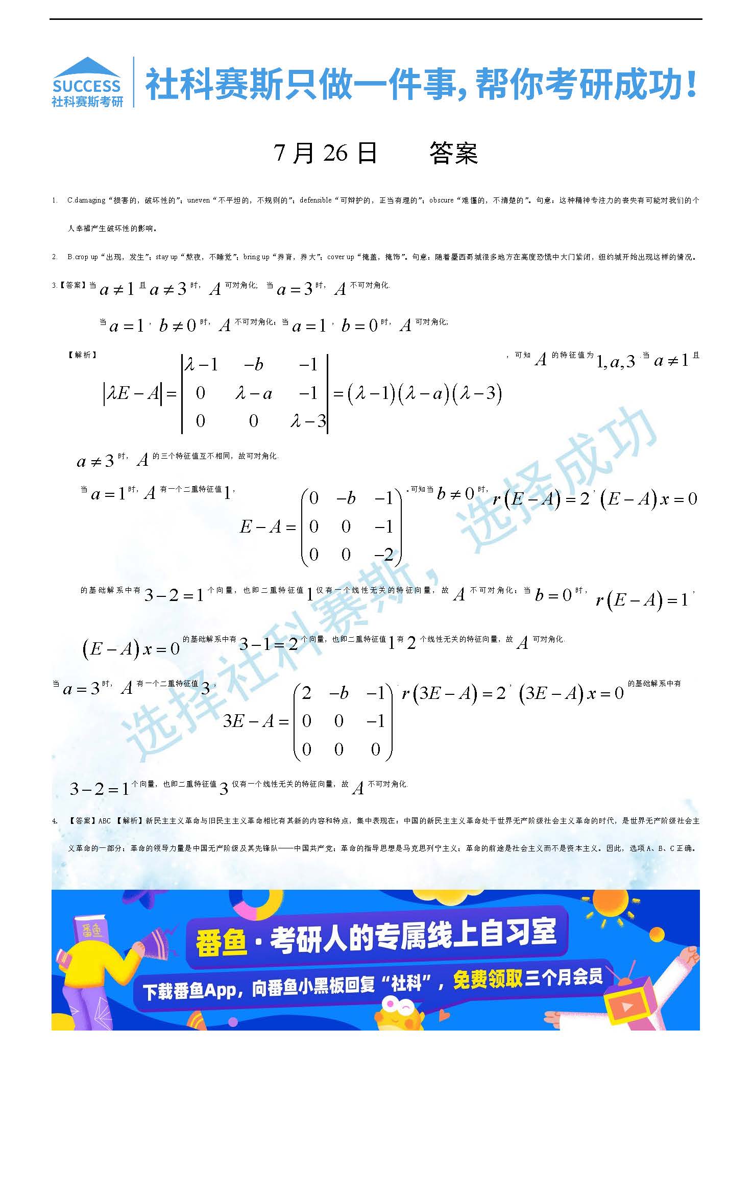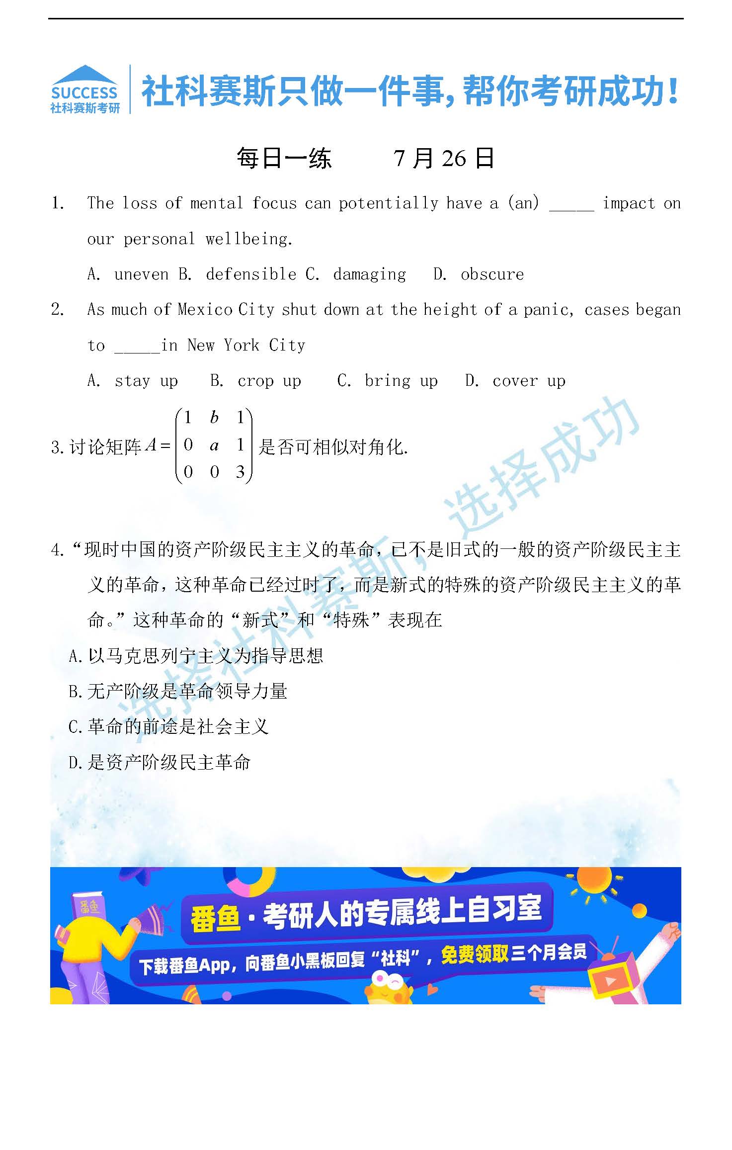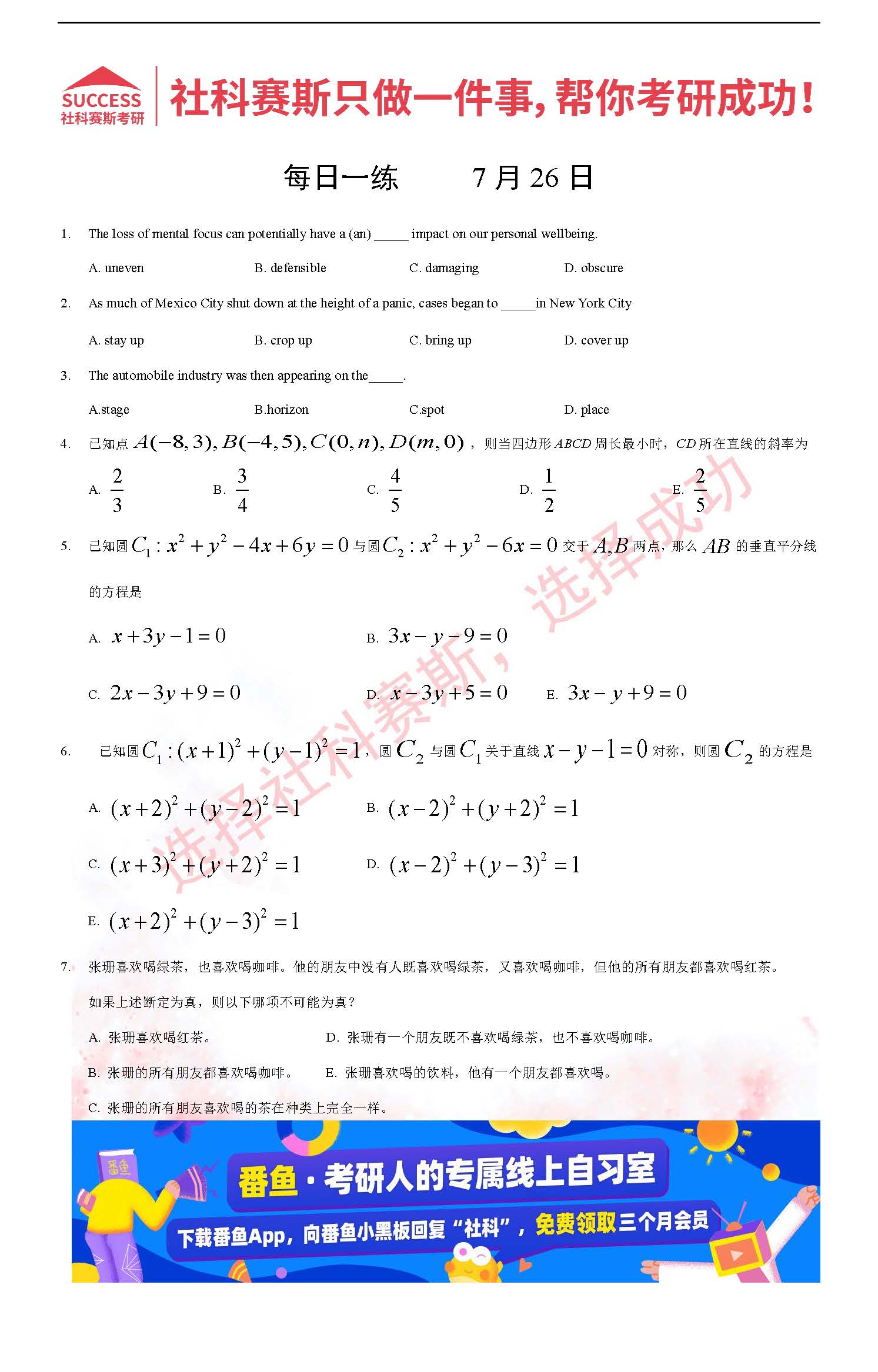 導(dǎo)讀:考研是一場(chǎng)持久戰(zhàn),保持良好的學(xué)習(xí)習(xí)慣,是能確保復(fù)習(xí)高效的關(guān)鍵。今天社科賽斯MBA備考網(wǎng)小編整理了“2022管理類聯(lián)考7月26日每日一練及答案”的內(nèi)容,希望能對(duì)廣大考生有所幫助。