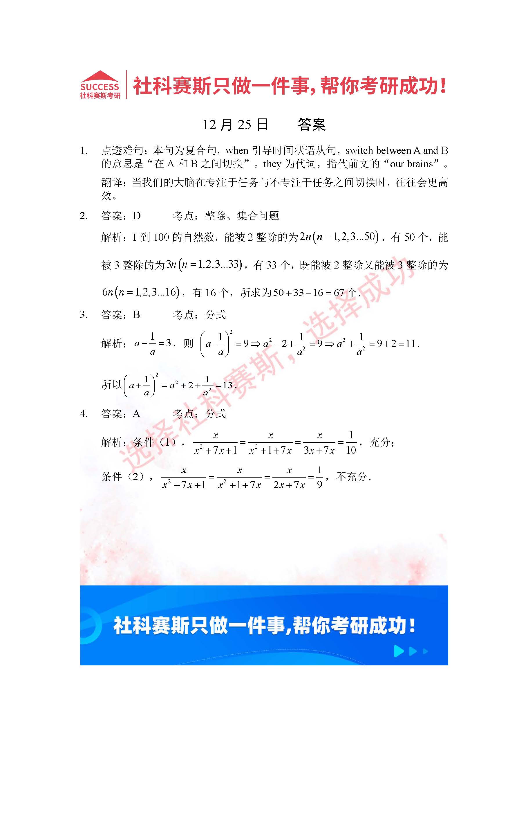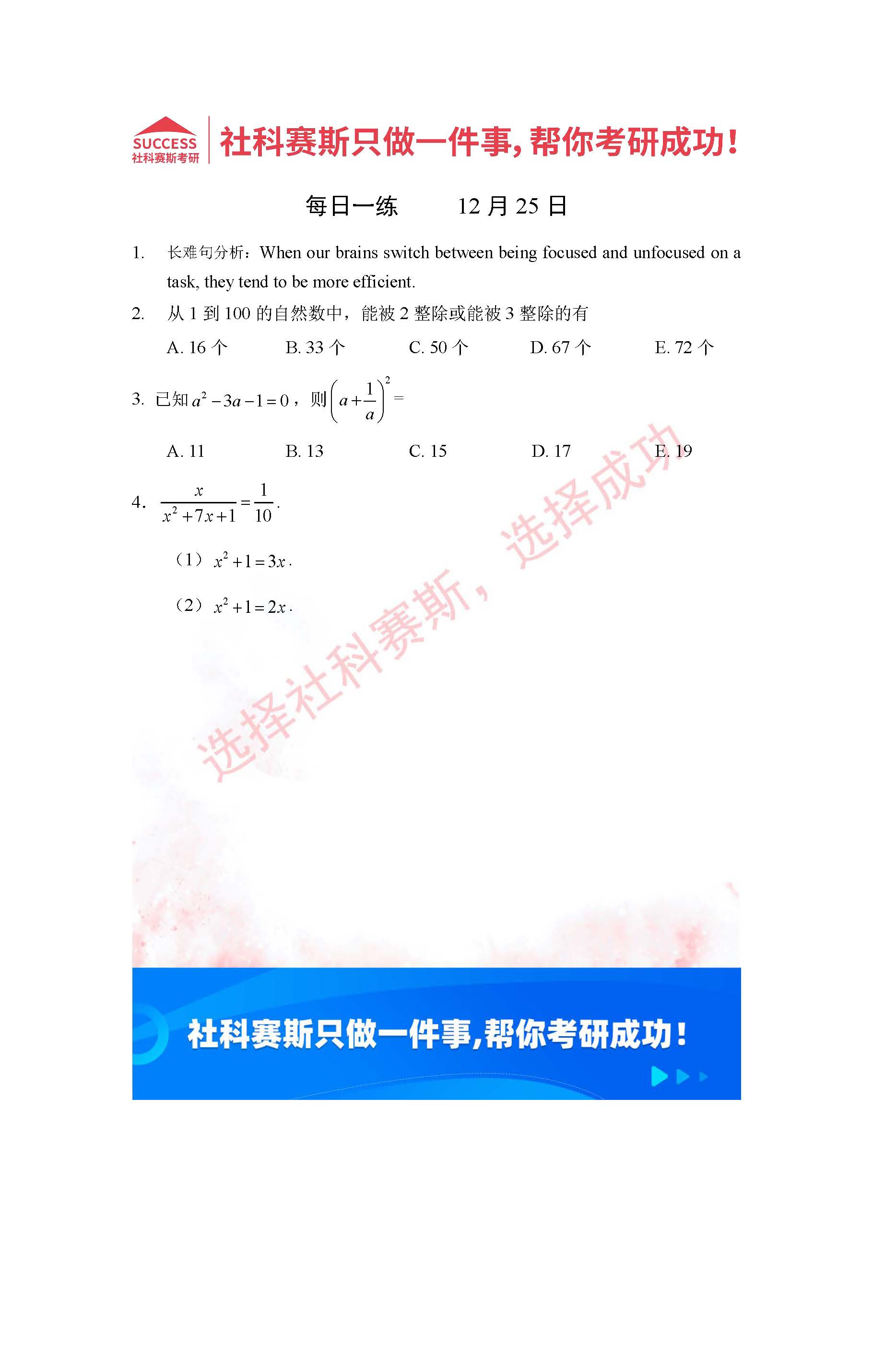 導(dǎo)讀:考研是一場持久戰(zhàn),保持良好的學(xué)習(xí)習(xí)慣,是能確保復(fù)習(xí)高效的關(guān)鍵。今天社科賽斯MBA備考網(wǎng)小編整理了“2022管理類聯(lián)考12月25日每日一練及答案”的內(nèi)容,希望能對廣大考生有所幫助。