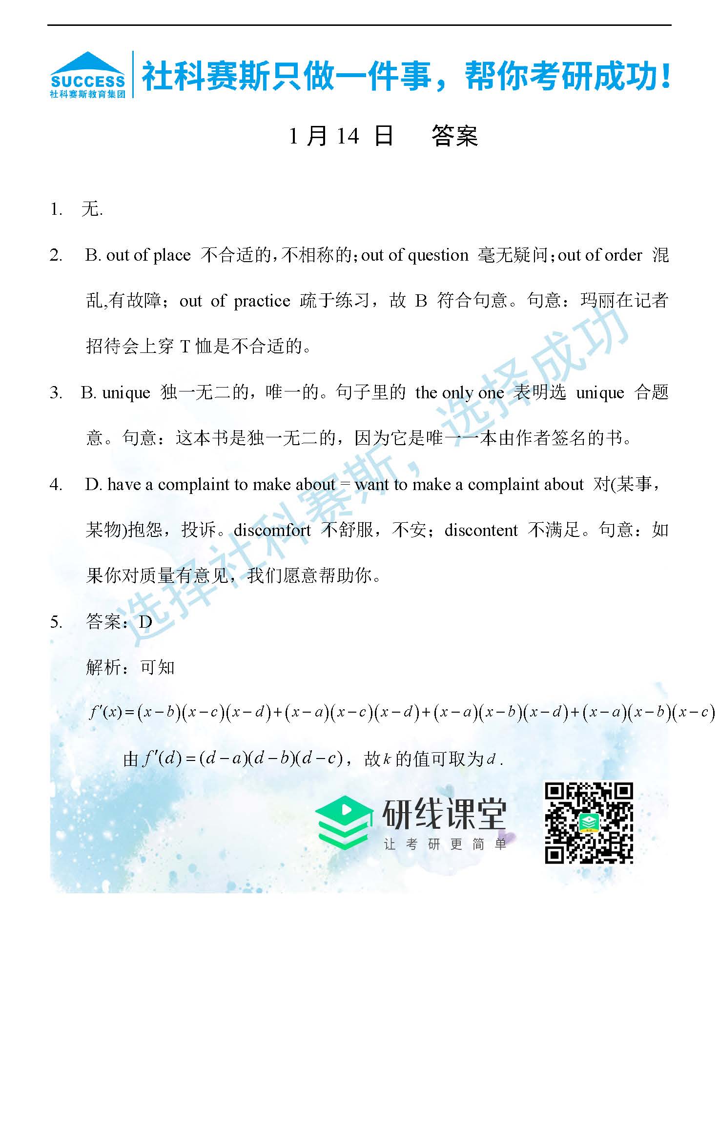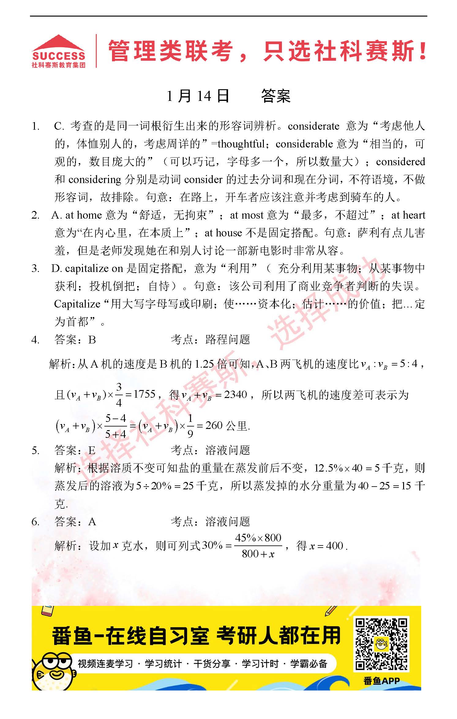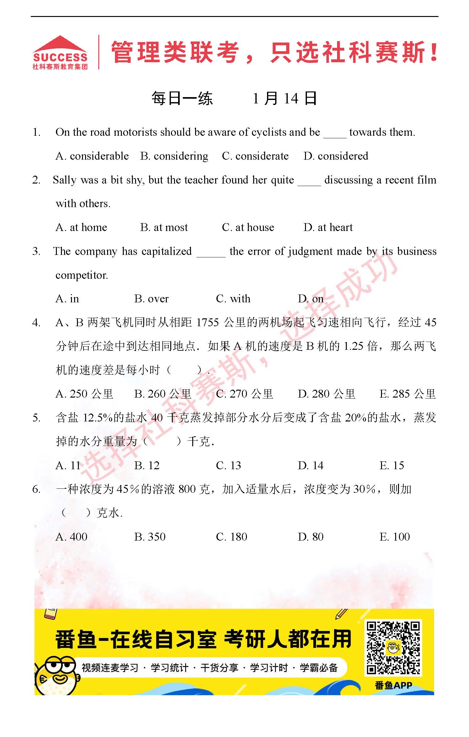 導(dǎo)讀:考研是一場(chǎng)持久戰(zhàn),保持良好的學(xué)習(xí)習(xí)慣,是能確保復(fù)習(xí)高效的關(guān)鍵。今天社科賽斯MBA備考網(wǎng)小編整理了“2022管理類聯(lián)1月14日每日一練及答案”的內(nèi)容,希望能對(duì)廣大考生有所幫助。