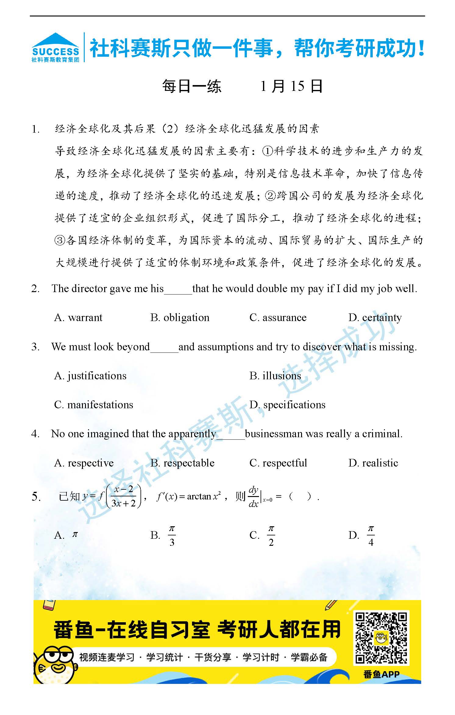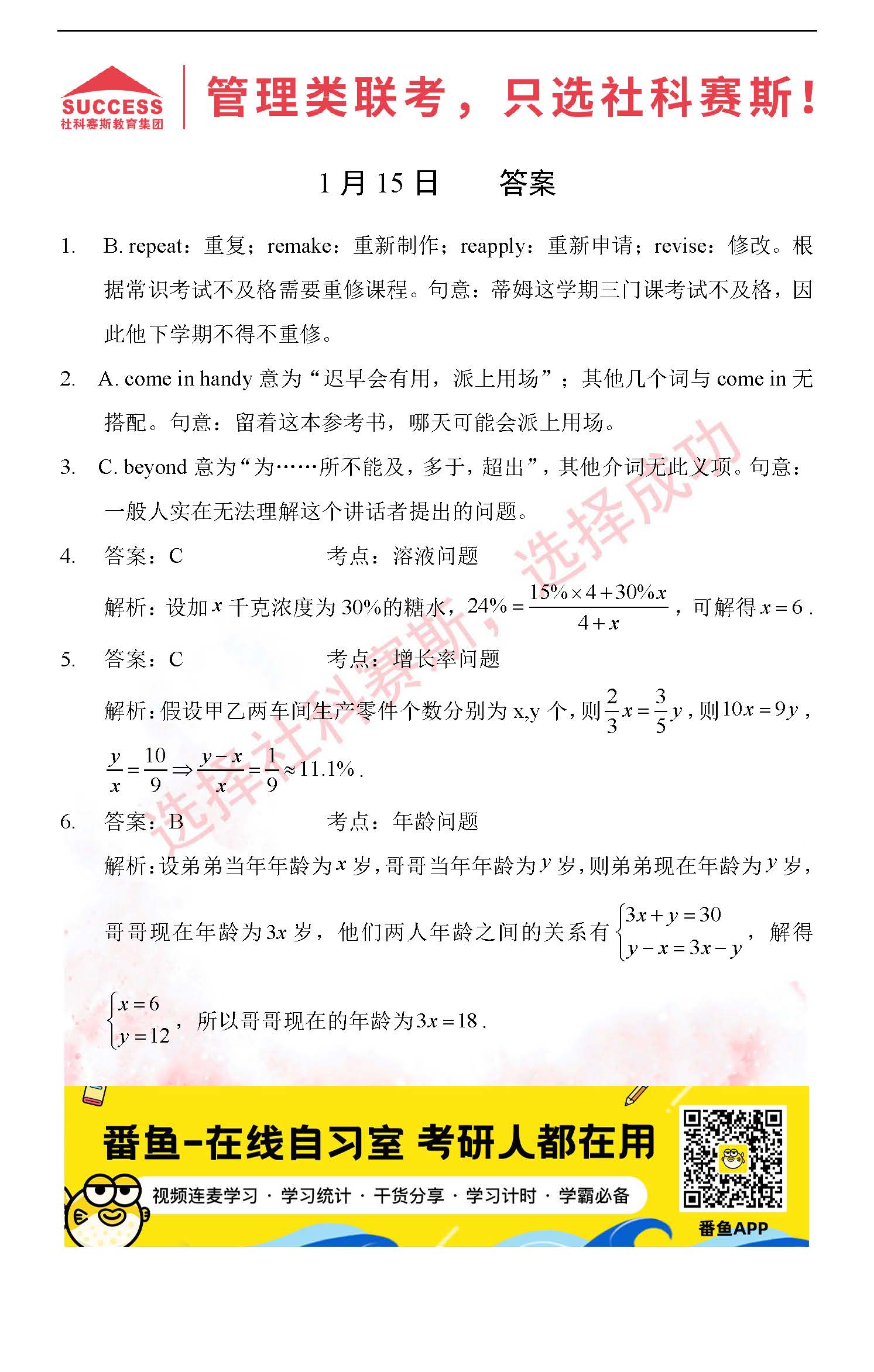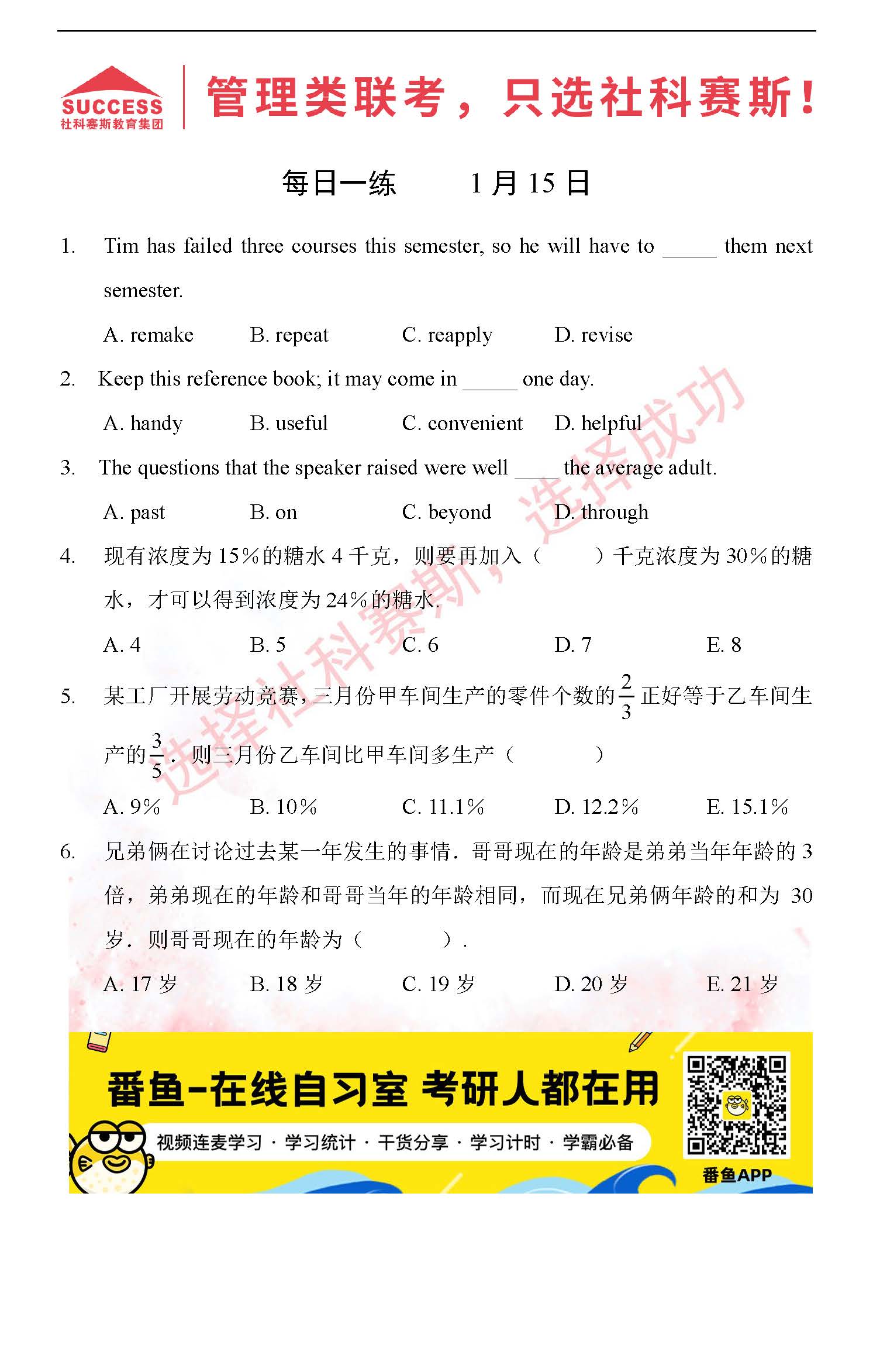 導(dǎo)讀:考研是一場(chǎng)持久戰(zhàn),保持良好的學(xué)習(xí)習(xí)慣,是能確保復(fù)習(xí)高效的關(guān)鍵。今天社科賽斯MBA備考網(wǎng)小編整理了“2022管理類(lèi)聯(lián)1月15日每日一練及答案”的內(nèi)容,希望能對(duì)廣大考生有所幫助。