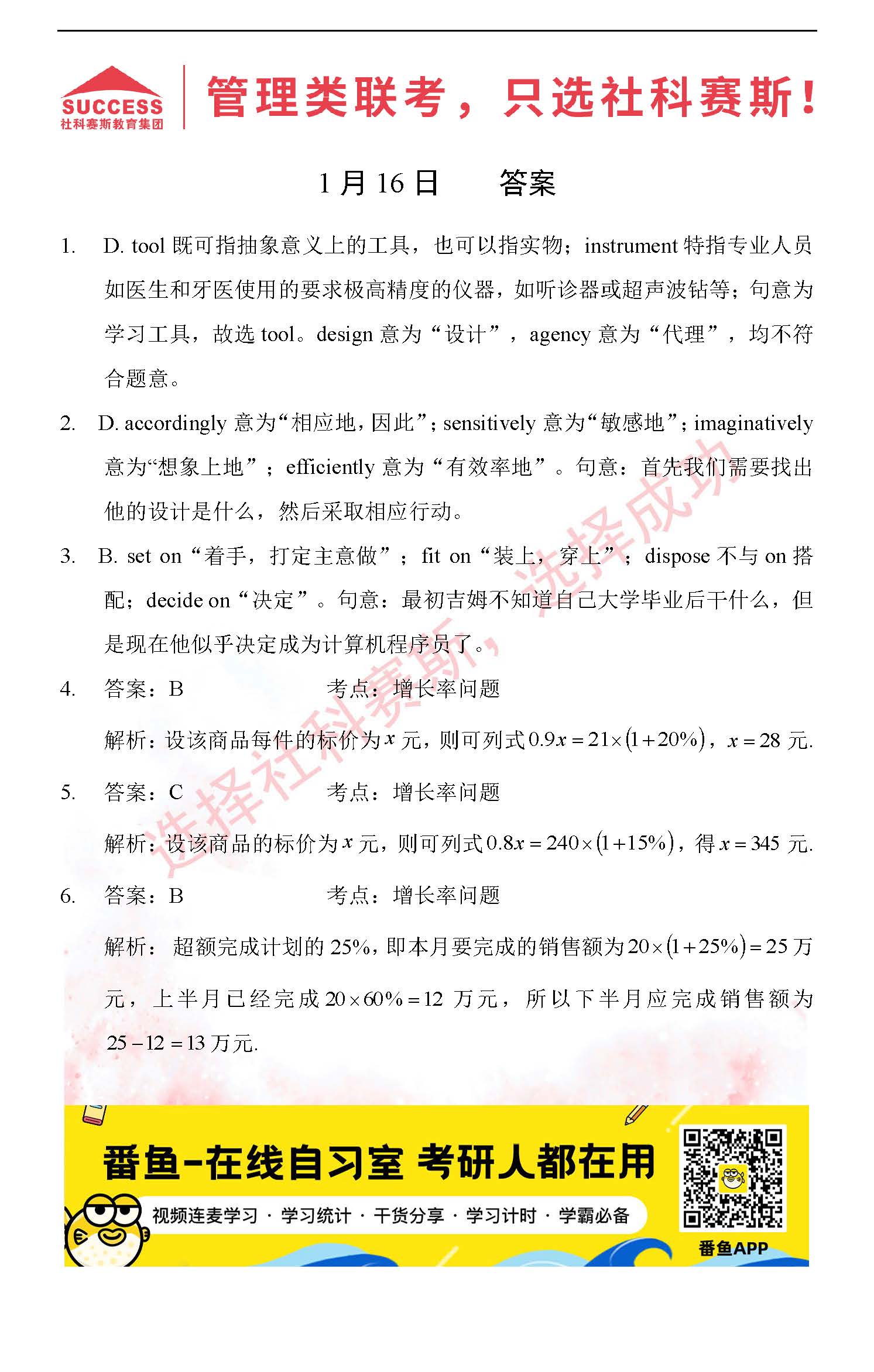 導(dǎo)讀:考研是一場持久戰(zhàn),保持良好的學(xué)習(xí)習(xí)慣,是能確保復(fù)習(xí)高效的關(guān)鍵。今天社科賽斯MBA備考網(wǎng)小編整理了“2022管理類聯(lián)1月16日每日一練及答案”的內(nèi)容,希望能對廣大考生有所幫助。