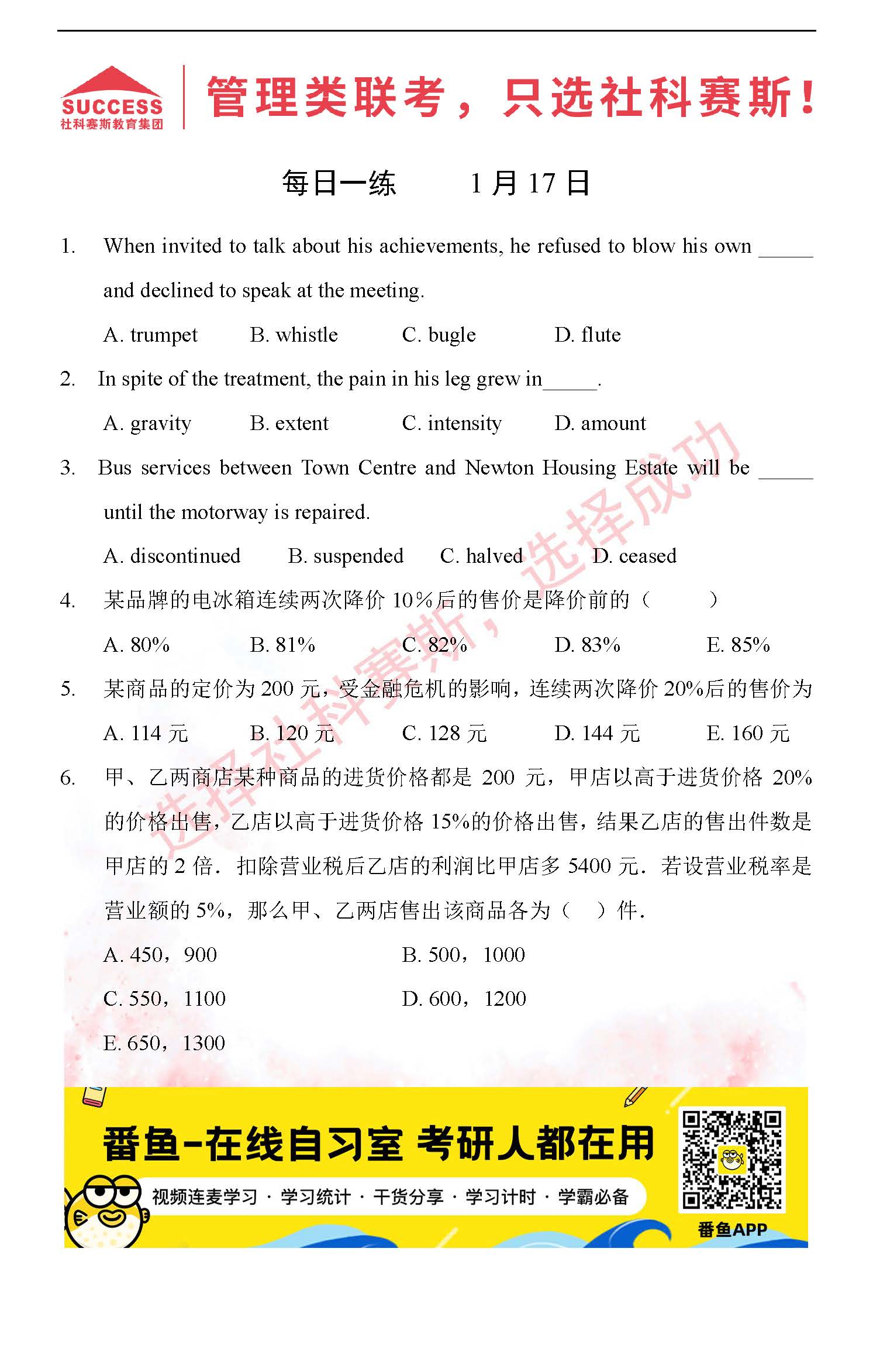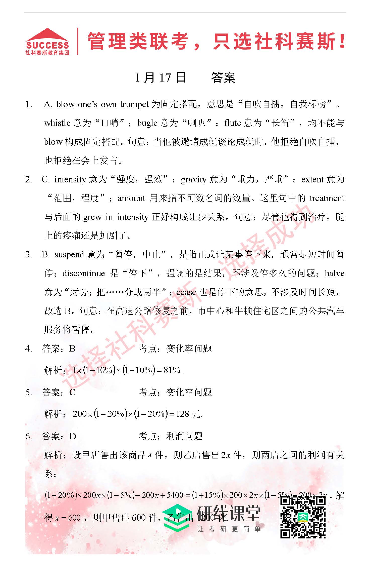 2022管理類聯(lián)考1月17日每日一練及答案”