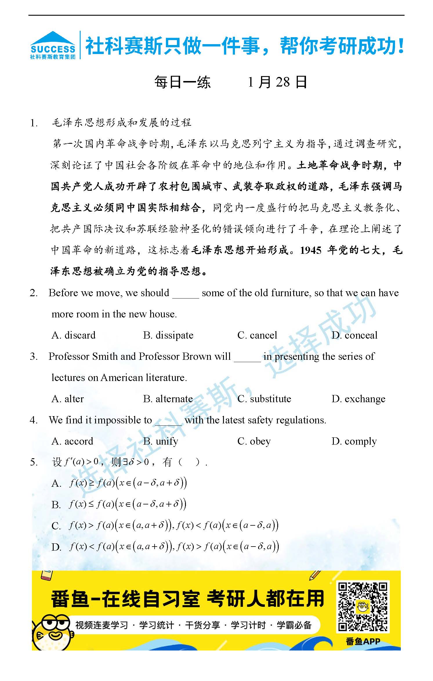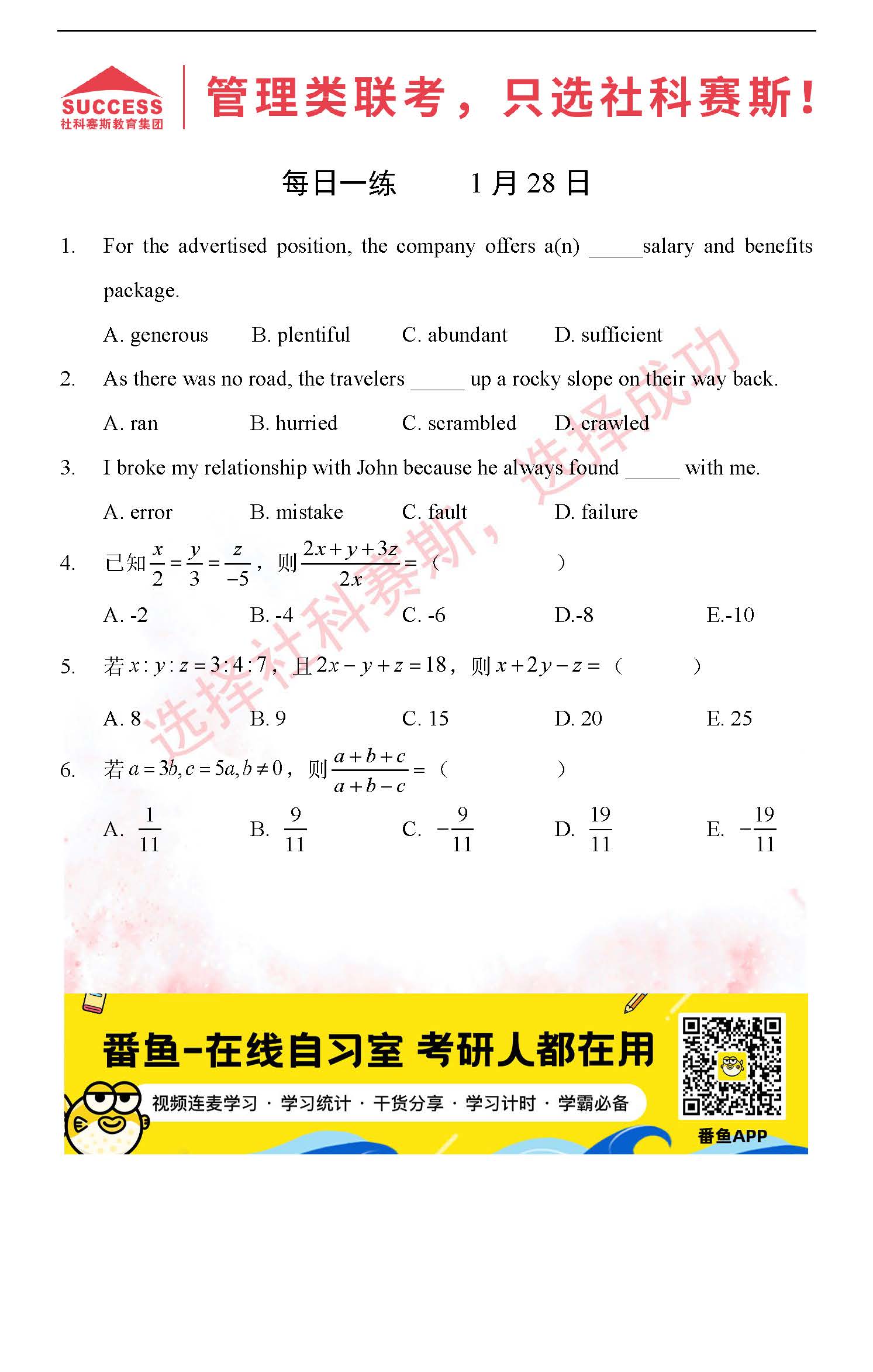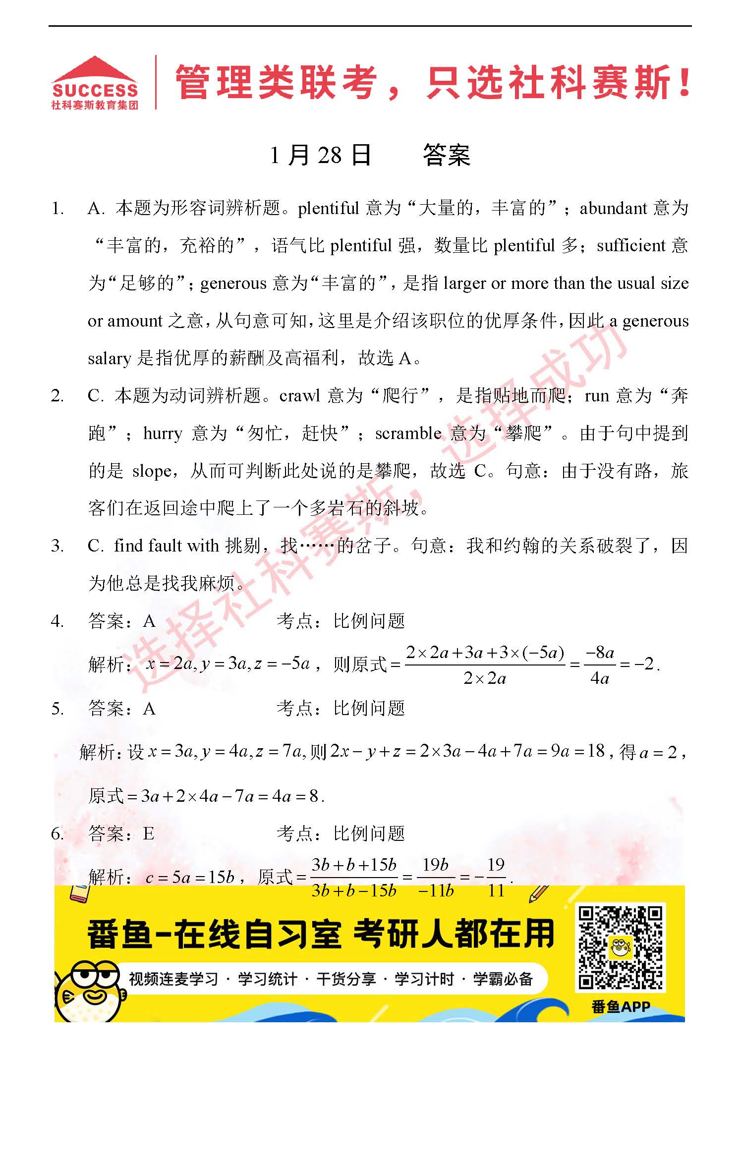 導(dǎo)讀:考研是一場(chǎng)持久戰(zhàn),保持良好的學(xué)習(xí)習(xí)慣,是能確保復(fù)習(xí)高效的關(guān)鍵。今天社科賽斯MBA備考網(wǎng)小編整理了“2022管理類聯(lián)1月28日每日一練及答案”的內(nèi)容,希望能對(duì)廣大考生有所幫助。