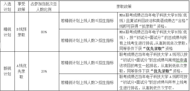 (2)入選新銳計(jì)劃且第一志愿報(bào)考電子科技大學(xué)MBA的考生,在聯(lián)考成績通過電子科技大學(xué)A線后,如個(gè)人提出申請(qǐng)也可再次參加常規(guī)批綜合面試,取兩次面試高者與常規(guī)批申請(qǐng)?jiān)擁?xiàng)目的考生一起排名,從高到低依次錄取。