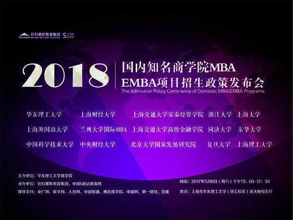 2016年5月6日,社科賽斯教育集團(tuán)、中國MBA教育網(wǎng)將聯(lián)合上海、北京、浙江、安徽等15所院校,聯(lián)合承辦“國內(nèi)知名商學(xué)院MBA項(xiàng)目(2018)招生政策發(fā)布會(huì)”。