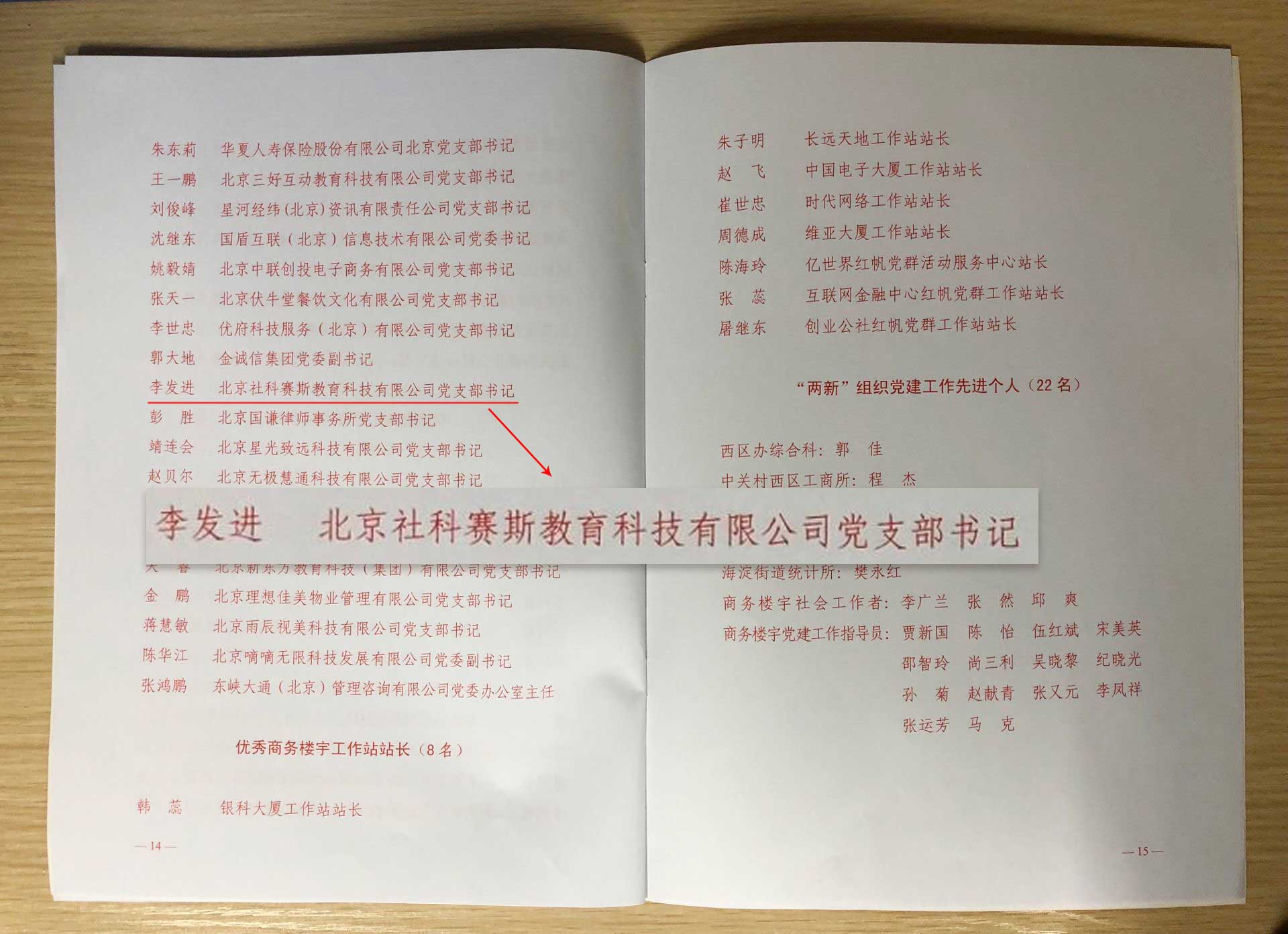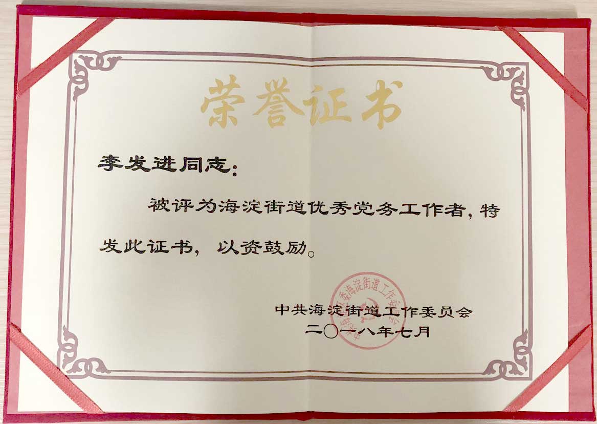 北京北京社科賽斯黨支部書記李發(fā)進被評為海淀街道優(yōu)秀黨務工作者