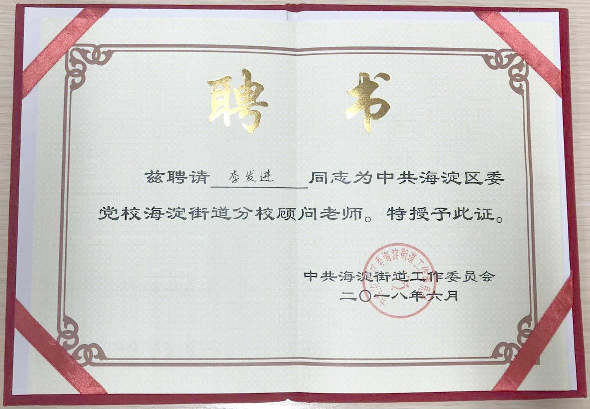 北京北京社科賽斯黨支部書記李發(fā)進被評為海淀街道分校顧問老師