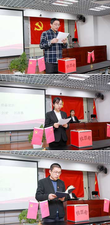 隨后進行預(yù)備黨員轉(zhuǎn)正大會。劉愛、張游嘉兩名預(yù)備黨員分別鄭重地向黨組織匯報了自身預(yù)備期間的思想情況、工作情況,以端正積極的態(tài)度表達了轉(zhuǎn)為正式黨員的強烈愿望;入黨介紹人分別就兩位同志預(yù)備期間的表現(xiàn)發(fā)表了意見,組織委員代表支委會介紹預(yù)備黨員在預(yù)備期的表現(xiàn)情況,肯定成績,指出缺點和不足,提出能否轉(zhuǎn)正的意見;經(jīng)過與會黨員的充分討論之后,進行無記名投票。