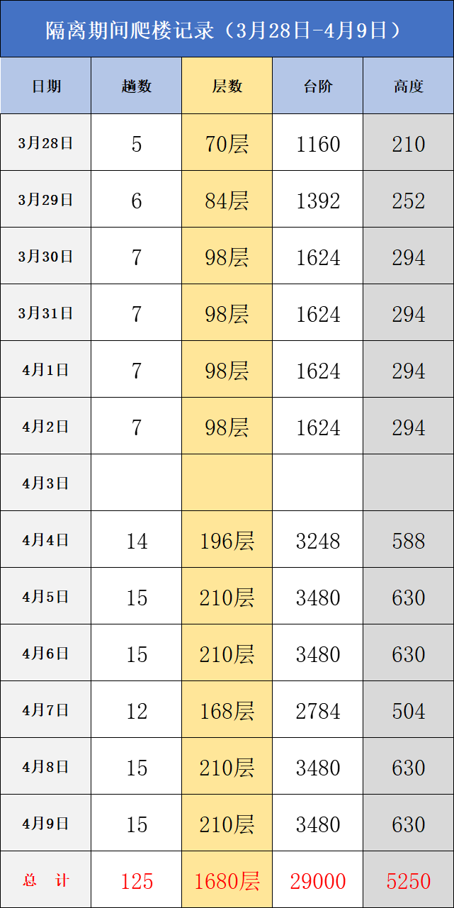 下表是我隔離期間爬樓的記錄,大家有沒(méi)有興趣挑戰(zhàn)一下: