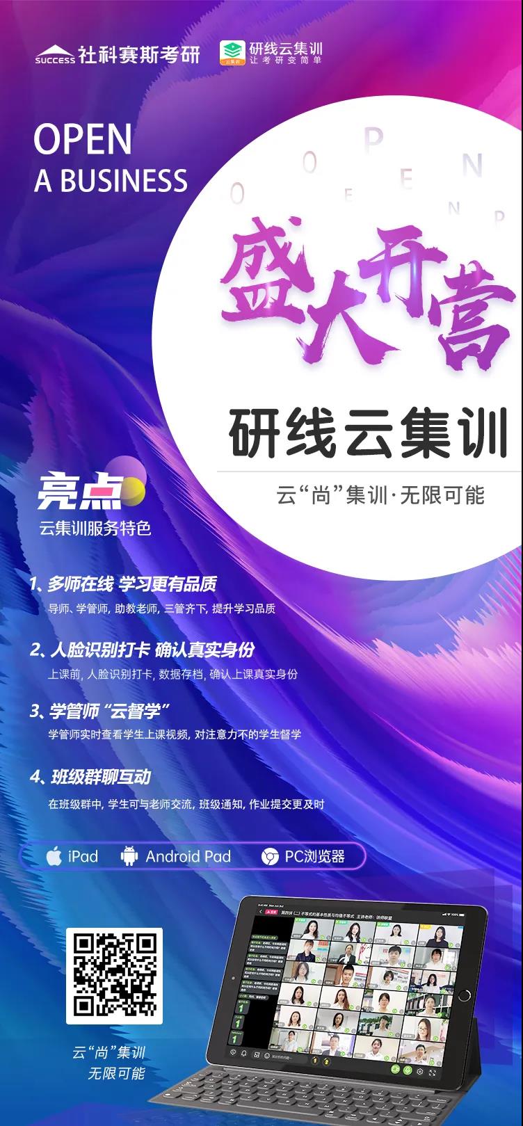 社科賽斯·研線云集訓是社科賽斯獨立、自主、創(chuàng)新性研發(fā)的一款專注于考研集訓營的在線云集訓平臺,并具有完全獨立自主知識產(chǎn)權,是業(yè)內(nèi)首家實現(xiàn)云集訓的數(shù)字化教育平臺,具有云集訓、云監(jiān)督、AI拍照識別、云簽到、多師協(xié)同授課、分組管理、智能提醒等多種特色功能。通過多師在線、人臉識別打卡 、學管師云督學、班級群聊互動等方式有效解決“沒有氛圍,難以交流,易受干擾,聽課隨意”的線上學習四大難題,提供宛如線下見面的課堂氛圍。云尚集訓 無限可能 研線云集訓App重磅上線
