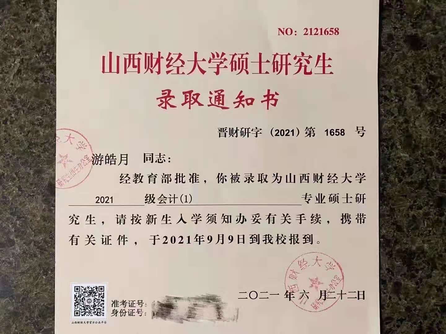 山西財(cái)經(jīng)大學(xué)碩士研究生錄取通知書