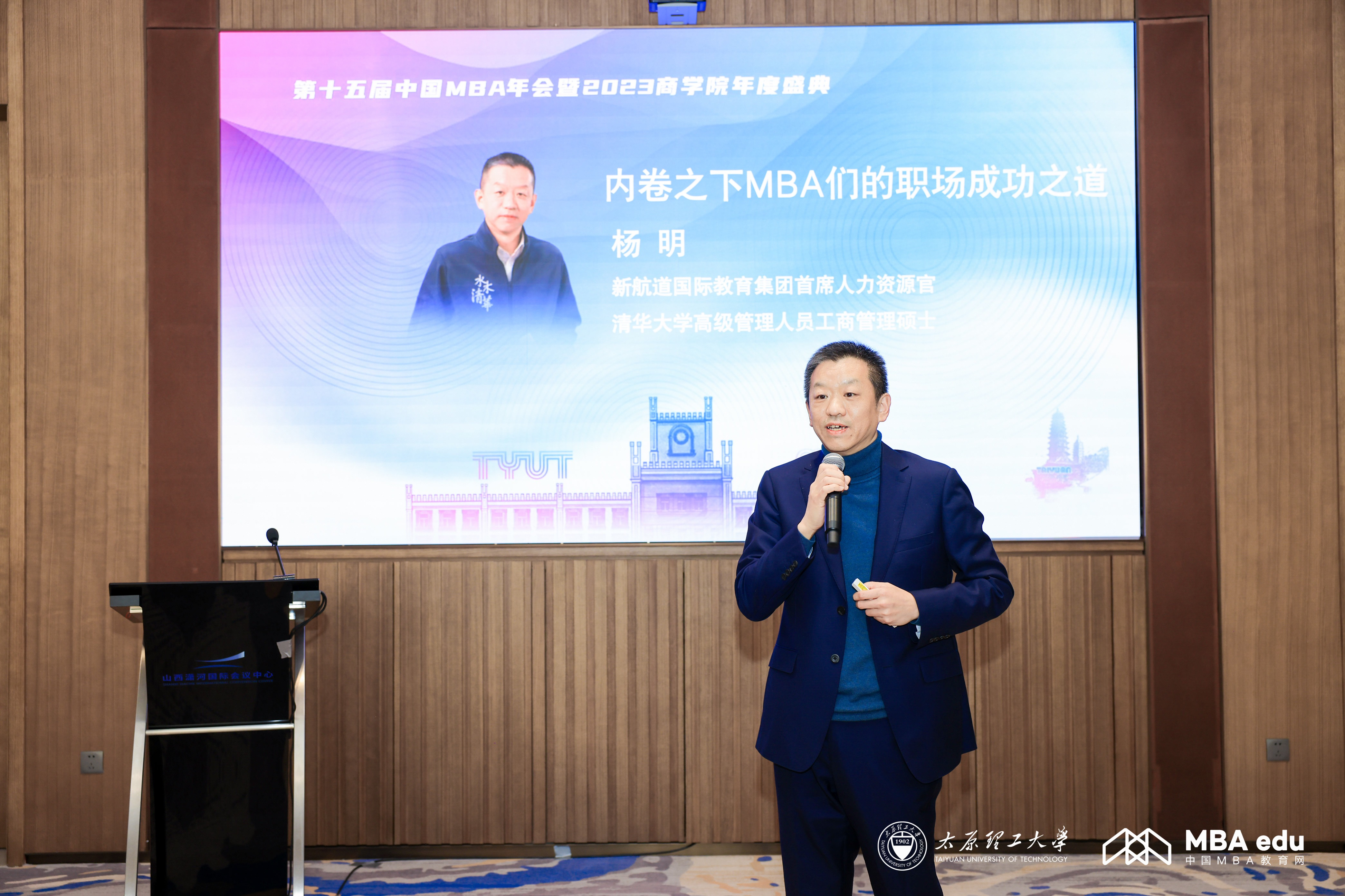 新航道國際教育集團(tuán)首席人力資源官、清華大學(xué)高級(jí)管理人員工商管理碩士楊明進(jìn)行了主題為《內(nèi)卷之下MBA們的職場(chǎng)成功之道》的精彩演講。他指出,內(nèi)卷之下,職場(chǎng)人要具有激勵(lì)別人的能力、積極向上的活力、執(zhí)行力、決斷力、激情來獲取核心競(jìng)爭力。通過引用案例,他表示,要通過明確目標(biāo)、抓住重點(diǎn)、優(yōu)化環(huán)境來獲得職場(chǎng)認(rèn)同;丟掉負(fù)面思維、樹立正面思維、改造學(xué)生思維變得更加積極向上,富有能量;主動(dòng)實(shí)現(xiàn)搶跑,專注實(shí)現(xiàn)更好,學(xué)習(xí)成長更快變得更有激情;管理情緒,勤能補(bǔ)拙,兼具沉穩(wěn)與勇氣變得更具有執(zhí)行力。