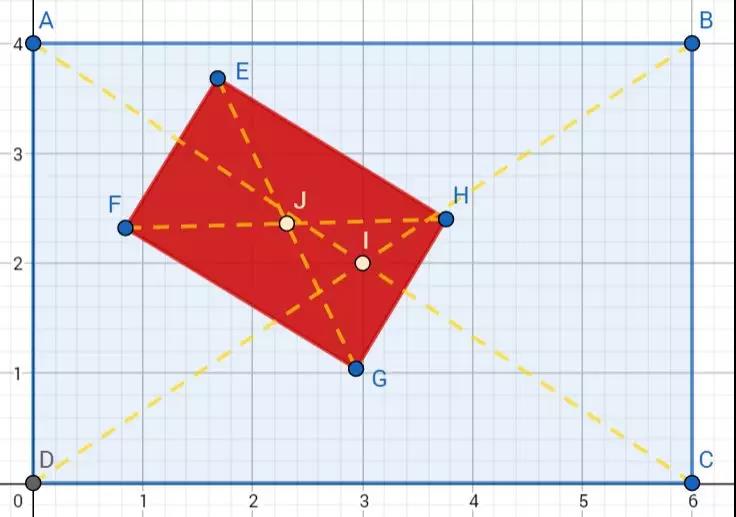 面包片(長方形ABCD)上面平鋪著一塊小火腿片(長方形EFGH),現(xiàn)在我們來動(dòng)刀子了,怎么樣才能一刀(一條直線)切下去,使得面包片和火腿片剛好完全平分。