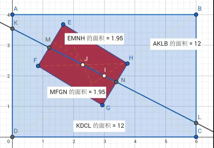 其實(shí),平分長方形面積的方法有很多,但是每一種方法都離不開它的——中心點(diǎn)。我們連接面包片和火腿片的對角線,找到了中心點(diǎn)I和J。