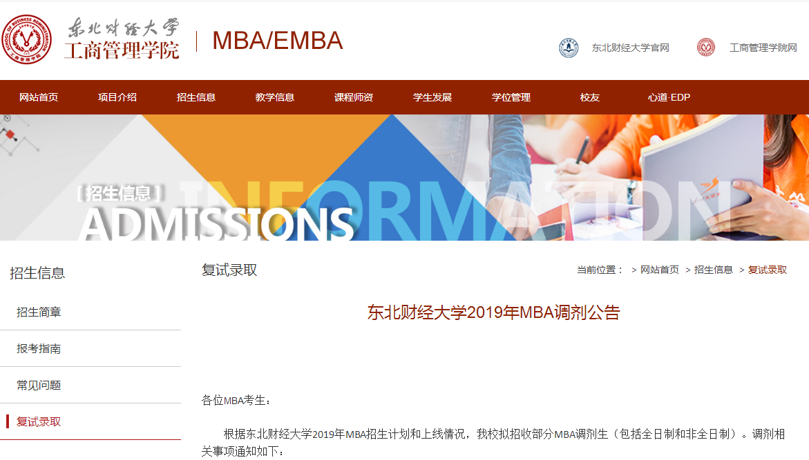 根據(jù)東北財(cái)經(jīng)大學(xué)2019年MBA招生計(jì)劃和上線情況,我校擬招收部分MBA調(diào)劑生(包括全日制和非全日制)。調(diào)劑相關(guān)事項(xiàng)通知如下: