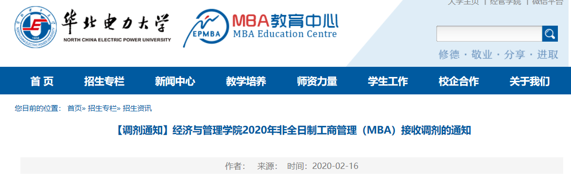 2020年華北電力大學經濟與管理學院非全日制工商管理(MBA)專業(yè)學位(領域代碼:125100)預計可接收調劑考生,符合我校調劑條件、有調劑意向的考生在中國研究生招生信息網(wǎng)全國調劑系統(tǒng)開放后,按照MBA教育中心網(wǎng)站上后續(xù)發(fā)出的調劑通知上的要求,務必在截止時間前在全國調劑系統(tǒng)中進行報名。