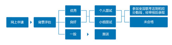 MBA提前面試一般按照如下圖所示流程進行:首先考生登陸各大院校官方網(wǎng)頁,提交申請材料;各院校將根據(jù)申請材料做背景評估,從中篩選,而這一步就會篩掉近7成考生;材料通過之后院校公布面試名單,考生根據(jù)院校規(guī)定的面試時間參加面試,這才是見真格的關鍵時刻,乃提前面試的重中之重。許多優(yōu)秀考生正是在這一環(huán)節(jié),或因自身準備不足,或因競爭對手更強大等種種原因而被無情淘汰。