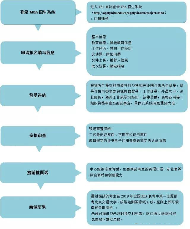 為選拔優(yōu)質(zhì)生源,增加考生自主選擇的機(jī)會,北京交通大學(xué)工商管理碩士(MBA)項目2019年將繼續(xù)實行“提前批面試+正常批面試”的招生政策,在招生流程上,秉承“公平、公正、公開、公信”的基本原則,凡在我校通過提前面試,且成績優(yōu)秀的考生在2019年全國MBA聯(lián)考中第一志愿報考北京交通大學(xué),成績達(dá)到國家線A線,即可取得“預(yù)錄取”資格。提前面試工作將于4月啟動,具體事宜如下:
