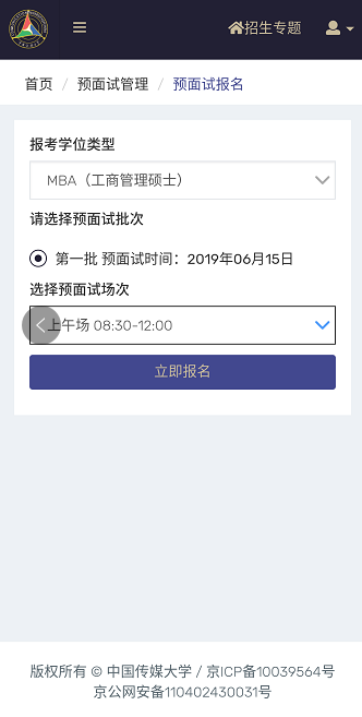 第四步:點(diǎn)擊“預(yù)面試報(bào)名”,選擇“學(xué)位類型、批次、場(chǎng)次”,提交信息,報(bào)名成功!
