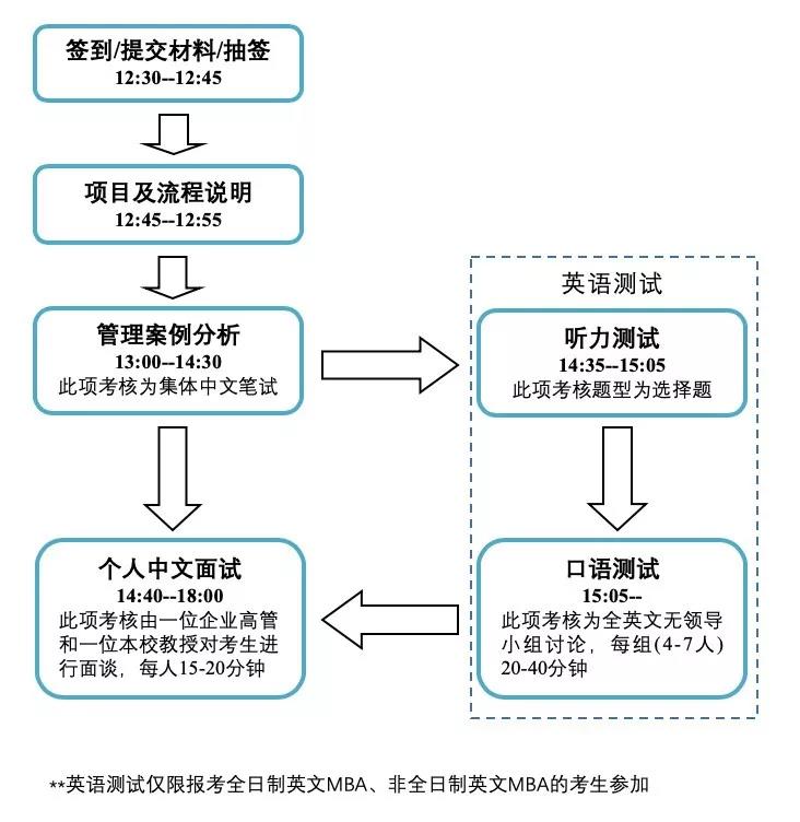 上外MBA預(yù)復(fù)試由管理案例分析、個人中文面試、英語測試(僅限報考全日制英文MBA、非全日制英文MBA的考生參加)三個環(huán)節(jié)構(gòu)成。具體流程安排如下: