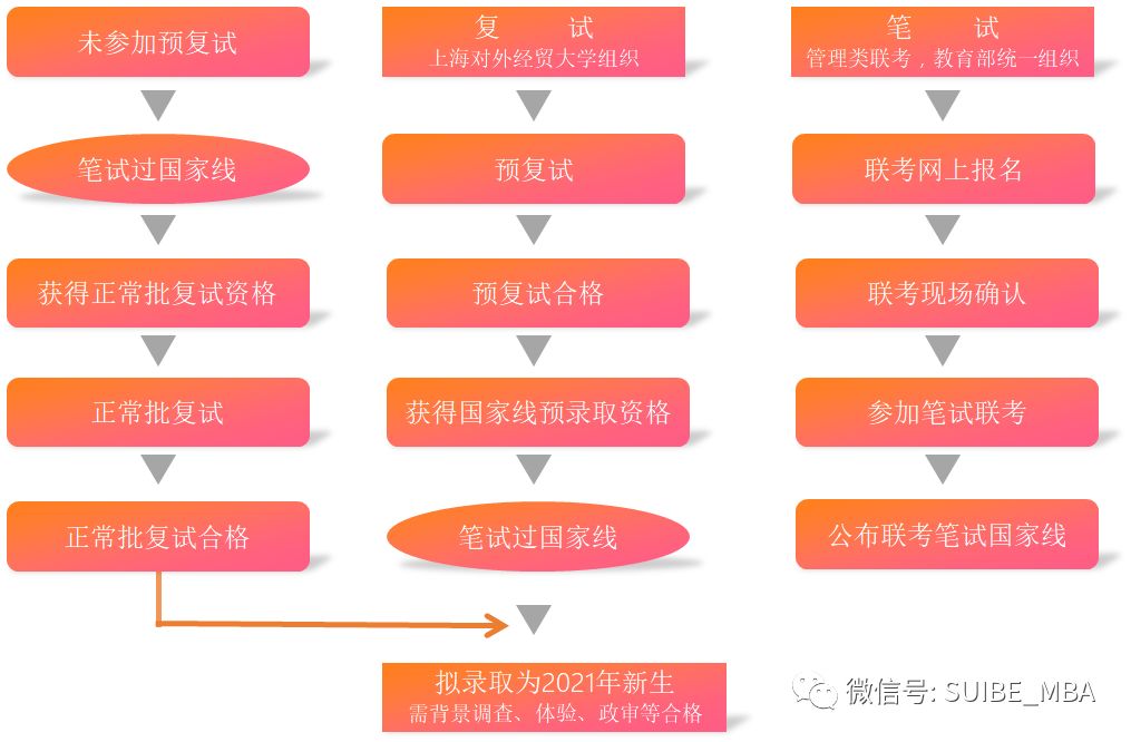 ?參加預(yù)復(fù)試并通過的考生,報考上海對外經(jīng)貿(mào)大學MBA項目,在全國管理類聯(lián)考成績達到國家復(fù)試分數(shù)線(例如2019年:總分≥170分,綜合≥84,英語≥42分),并完成國家規(guī)定的復(fù)試流程后同等條件下優(yōu)先錄取。