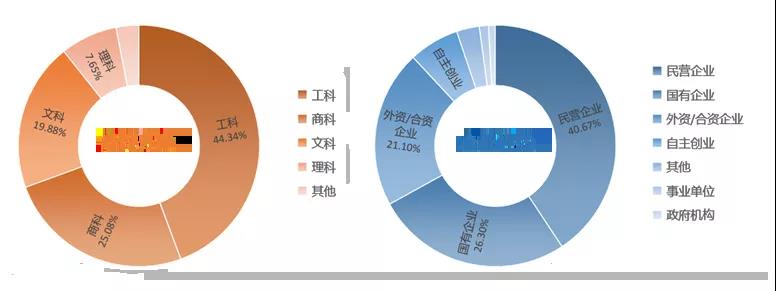 學(xué)科分布,工科、商科、文科、理科都占有一定的比例,工科占比最高;企業(yè)性質(zhì)以民營(yíng)企業(yè)為主,其次是國(guó)有,外資企業(yè),企業(yè)性質(zhì)較為多樣。