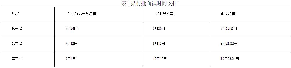 預(yù)計進行3次提前批面試,具體安排見表1(具體報名時間段,面試時間詳見每一批次面試前發(fā)布的具體通知)